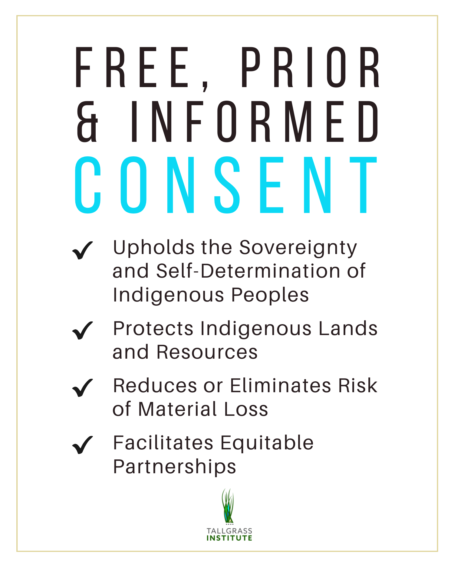 At the top of the discussion, [Tallgrass Institute Founder & Executive Director] Kate R. Finn highlighted basic tenets of the UNDRIP as the international consensus on the "minimum standards for the survival, dignity and well-being of the indigenous peoples of the world" (Article 43). As FPIC is enumerated by the UNDRIP, Finn outlined some broader concepts for its operationalization, noting:
