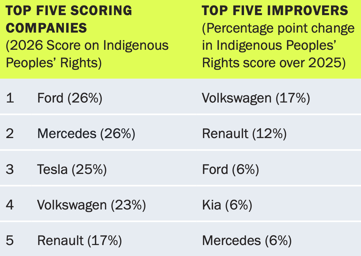The report acknowledged slow progress on Indigenous Peoples’ rights year-over-year, but noted the 2026 leaderboard saw the largest number of evaluated companies making improvements since the leaderboard first launched in 2023. Automakers taking initial steps on Indigenous Peoples’ rights were in the majority (12 out of 18) for the first time, and half of the companies improved their scores from last year.