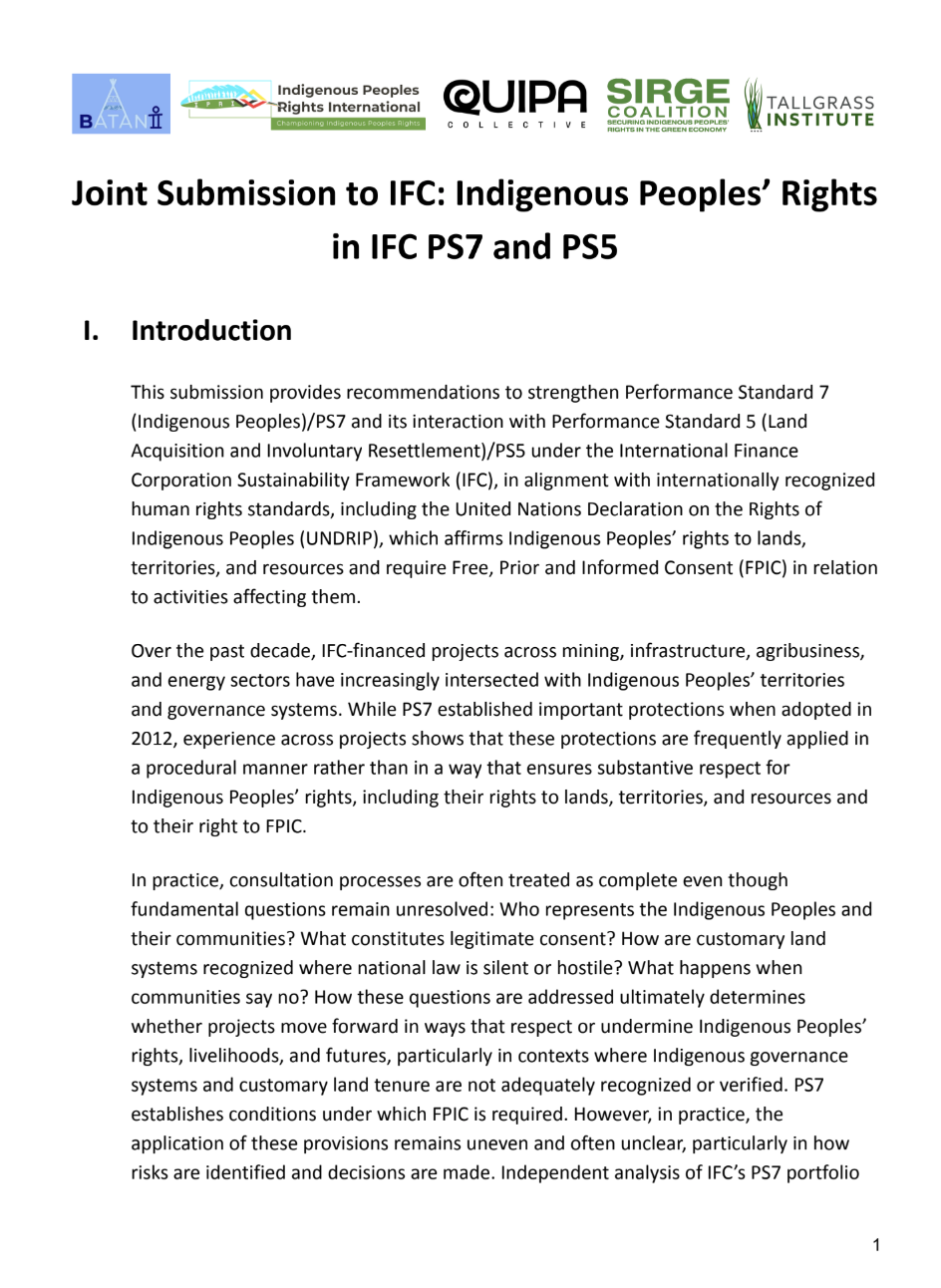 Learn more about Indigenous Peoples and the IFC and a prior submission requesting the IFC formalize a dedicated consultation process for Indigenous Peoples and form an Indigenous advisory group. The joint submission was delivered by Batani Foundation, Indigenous Peoples Rights International, Quipa Collective, Securing Indigenous Peoples’ Rights in the Green Economy (SIRGE) Coalition, and Tallgrass Institute.