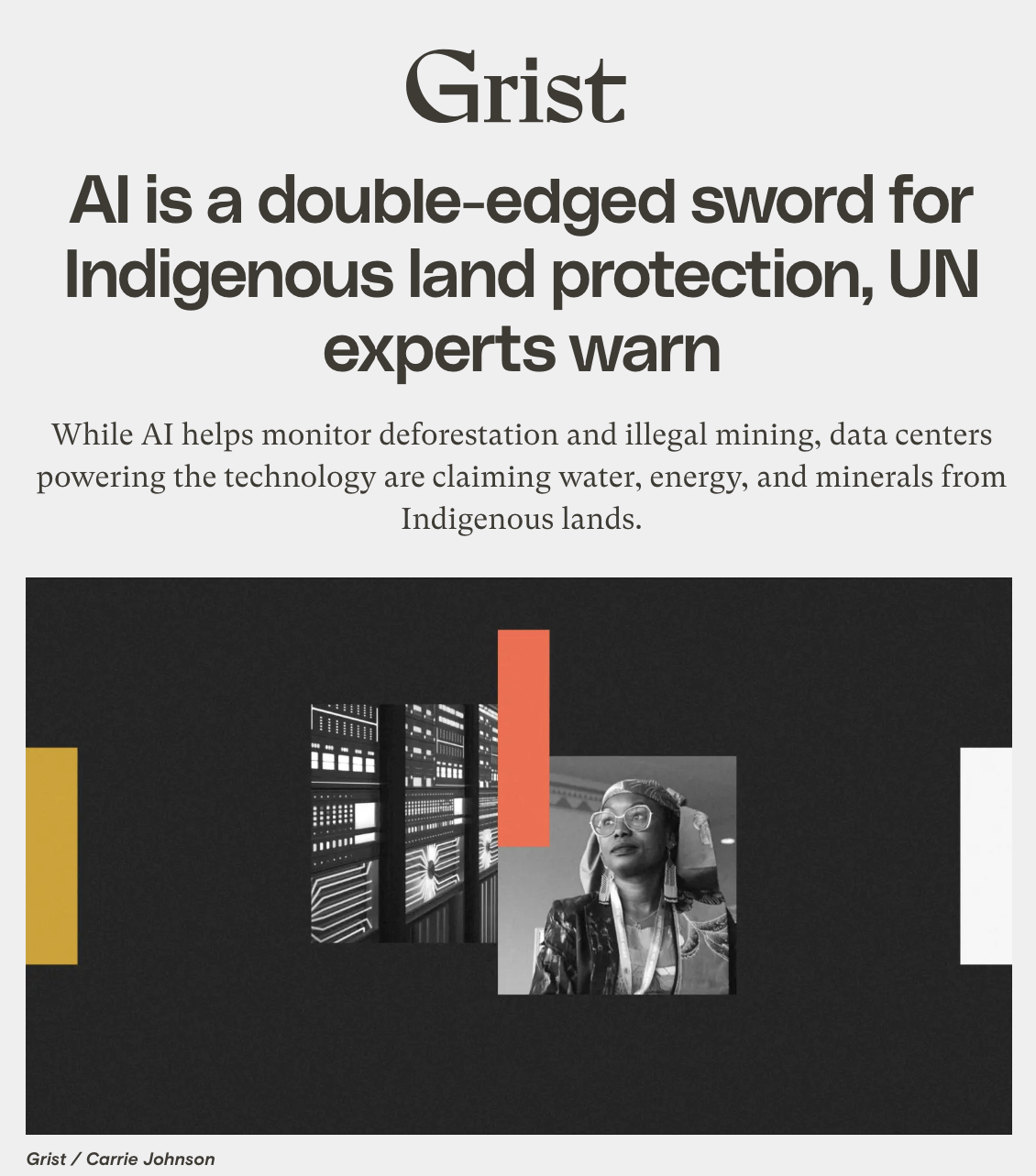 Grist as part of the Indigenous News Alliance reported on a new United Nations study about impacts to Indigenous Peoples from the AI technologies and infrastructure. The study, Indigenous Peoples and artificial intelligence was led by Hindou Oumarou Ibrahim, a former chair of the United Nations Permanent Forum on Indigenous Issues, where it was introduced this week. From the article: